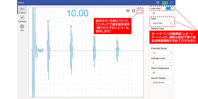 タブレットにリアルタイムでエコーを表示、感度・ゲートの調整や、測定値の保存ができます。さらに、2つのオート機能(オートゲイン&ゲート)により初心者でも簡単に測定できます。
