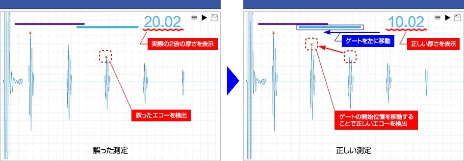 保存済みの測定が誤ったエコーを検出している場合は、後からゲート位置を調整することで検出点を変更し、正しい測定値に修正できます。